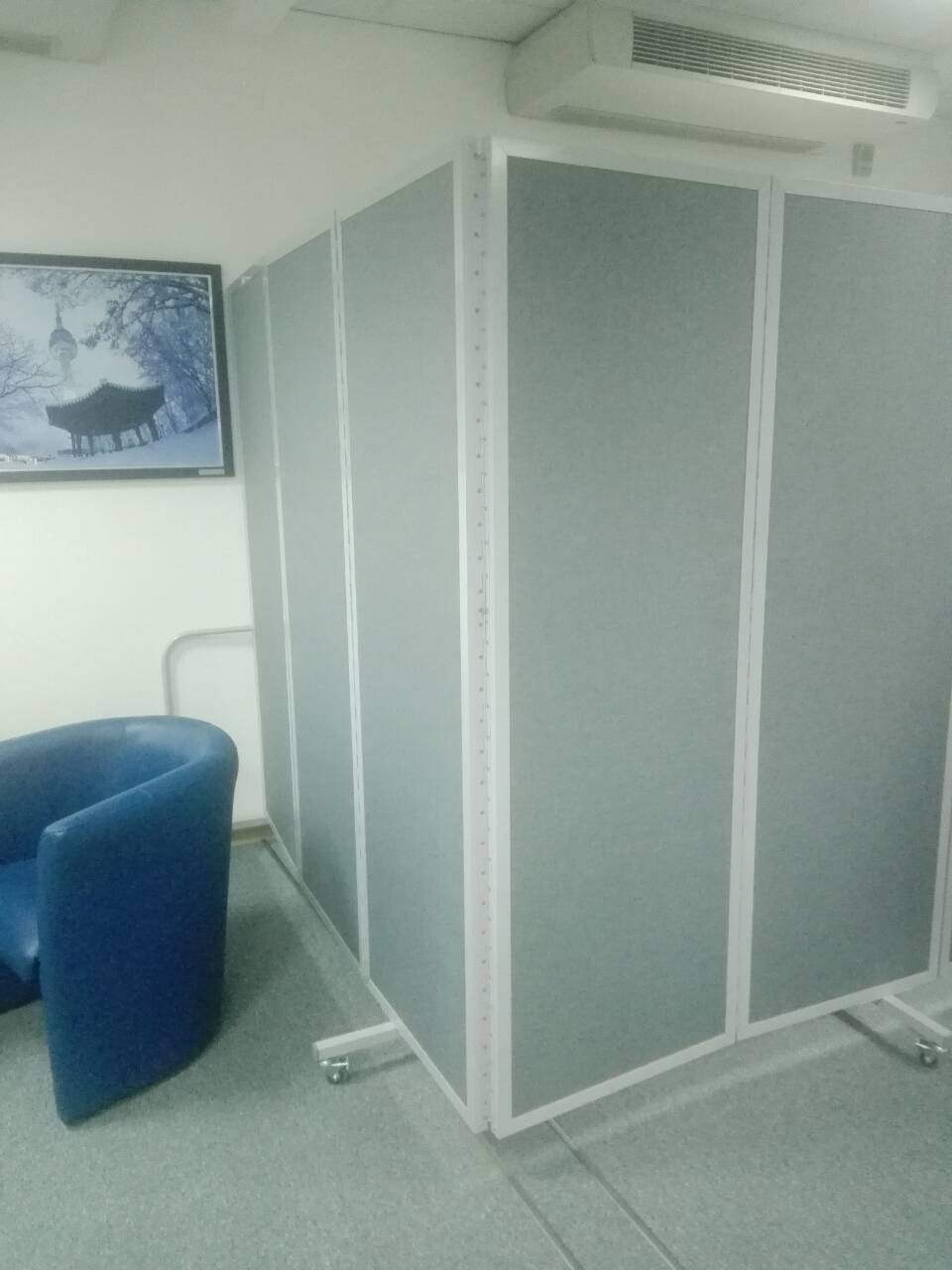 При создании ширмы возможно комбинирование панелей из различных материалов: пвх/сотопанелей с фотопечатью на пленке или с нанесением ткани, поликарбоната, а также установка магнитно-маркерной доски.